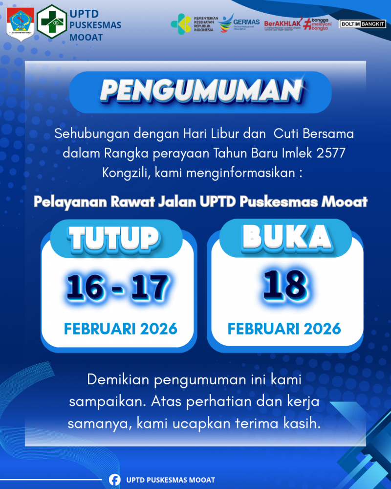 Mooat -- Dalam rangka memperingati Tahun Baru Imlek 2577 Kongzili, UPTD Puskesmas Mooat menyampaikan informasi penting kepada seluruh masyarakat terkait jadwal pelayanan.