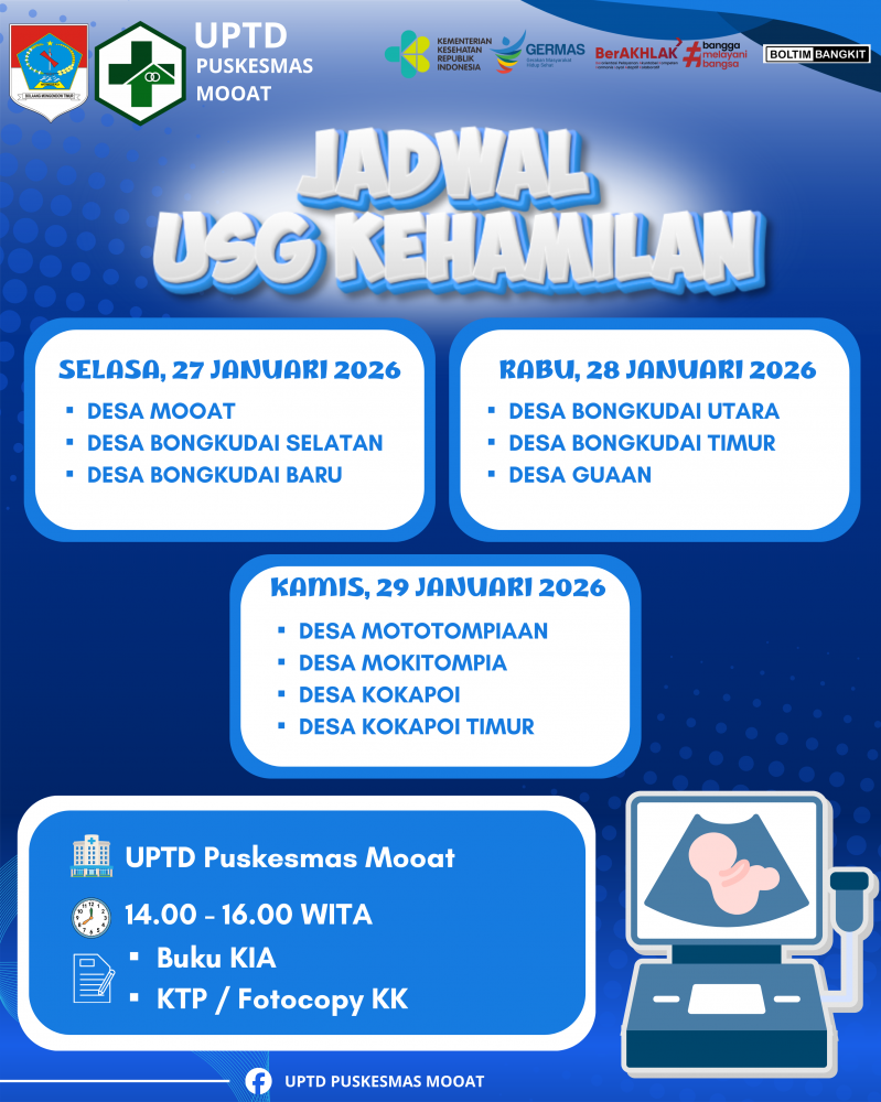 UPTD Puskesmas Mooat melaksanakan kegiatan Pemeriksaan USG Kehamilan Dasar Terbatas bagi ibu hamil sebagai bagian dari upaya peningkatan pelayanan kesehatan ibu dan janin di wilayah kerjanya.