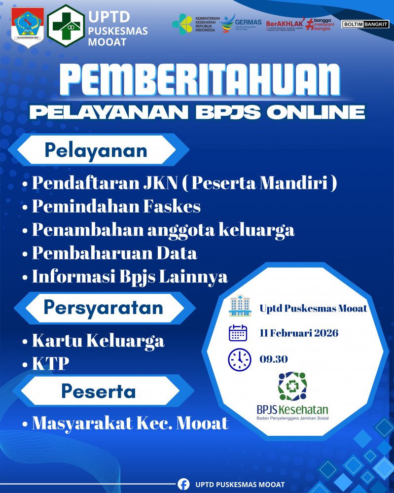 Pelayanan BPJS Online dilaksanakan pada Selasa, 11 Februari 2026, mulai pukul 09.30 WITA. Kegiatan ini bertempat di UPTD Puskesmas Mooat.
