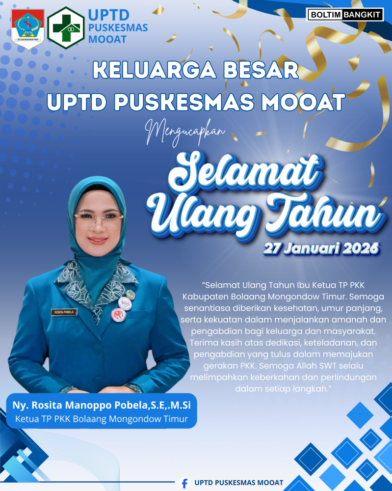 Keluarga Besar UPTD Puskesmas Mooat menyampaikan ucapan selamat ulang tahun kepada Ketua Tim Penggerak PKK Kabupaten Bolaang Mongondow Timur, Ny. Rosita Manoppo Pobela, S.E., M.Si, yang berulang tahun pada 27 Januari 2026.